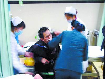 “挣脱后,根据事先的观察,我知道东面大约100米的地方就是屈家岭派出所。我没命地朝那个方向跑。后面的人穷追不舍,突然迎面出来一个人将我拦腰抱住摔倒在地,后面赶上来的人又对我拳打脚踢。十几只脚踢我的腰部,有两脚踢在我的肋骨上,钻心的疼痛,我感到肋骨断了……”躺在医院的郭启朝回忆。