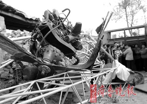 8日下午,在平阴县平阴镇前阮二村发生惊险一幕:一架三座简易超轻型飞机在飞行中突然一头栽下,扎进了下方的农家院内,机上一名驾驶员当场死亡,但事故未造成其他人员伤亡,坠落原因不明。
