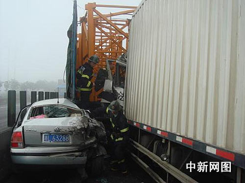 事故现场一片狼藉,货车、槽罐车、小汽车共八辆车连环撞在一起,受轻微撞击车辆内的司机在到场的交警等救援部门的协助下,从事故车上安全转移到地面;部分车辆受到了强烈的撞击,车头严重变形,其中一辆小汽车上的一名被困人员已经被确认死亡,两辆货车由于车头变形严重,有两名人员受伤被困车内。消防救援官兵利用液压剪、切割机等工具将挤压的车体一点一点破拆,经过约半个小时的努力,两名被困人员被成功救出,抬上救护车送往医院救治。