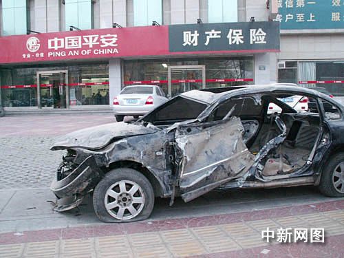 中新网保定4月13日电(记者 吕子豪)今日,记者在位于河北省保定市朝阳南路的平安保险公司保定分公司门前看到,一辆“面目全非”的帕萨特轿车横卧便道上,许多路经此地的群众对此指指点点。