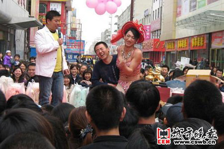 据主办方一位工作人员介绍,这位人妖是他们老板从哈尔滨请来的,专门为了开业助兴。商家主要考虑到松原从来没有在露天情况下进行人妖演出的,才大胆采用这种方式,希望能多赚点人气,以促进销售。