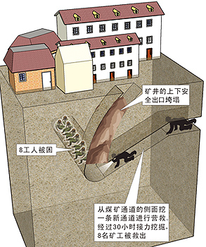 20日,杉木沟煤矿通道发生垮塌,8名已经进入矿井的工人被困。据彭水县政府相关人士介绍,从20日中午1时左右接到报告开始,县委、县政府有关负责人就立即率安监、消防等部门赶到现场组织救援,救援工作随即开始。在经过多方研究后,救援临时指挥部决定,由于进出通道被堵,只有从原先通道的侧面重新挖条通道,从而与旧通道相连。随后,50多人的救援队伍一直不间断地挖通道,到昨日晚上8时许,经过30小时接力挖掘,新旧管道终于连通,8名矿工被救了出来。