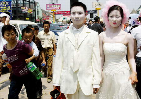 昨日,一对新人在洋人街上牵手漫步,惹来旁人羡慕眼光,谁知转过头来,两人却是一副僵尸扮相,吓倒一大片路人。新娘裸露在外的皮肤全部涂上了白粉,惟独嘴唇却是鲜红,如同刚刚吸完血,脖子上还有勒痕。新郎也是一身白,让人不寒而栗。据了解,这对“新人”自称展现的是行为艺术。