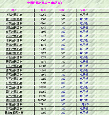 在“百度”上输入“股民资料”后查找,可以发现有多个网页宣称有全国各地的股民资料出售。其中,有的网站号称:“本站刚刚从证券公司内部获取最新65万多全国股民详细资料(高度保密文件),信息内容包括股民姓名、性别、地址、电话、手机等。欢迎定购!”