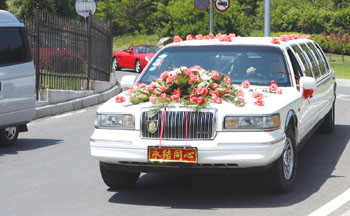 上午11时5分左右,采访车行驶到棒棰岛宾馆门前时,超豪华的婚礼车队正好从滨海路上行驶过来。记者粗略清点了一下,除了两辆法拉利跑车和两辆加长林肯婚车外,车队里还有悍马、保时捷等超豪华车。车队的主体是70多辆奔驰600豪华轿车,车队总数约80辆。一位业内人士称,这个车队的组成车辆平均单价在百万元左右,整个车队的价值可能近8000万元。记者注意到,车队内车辆牌照位置均已覆盖上了“花好月圆”、“百年好合”等招贴。车队鱼贯开进了棒棰岛宾馆,据称婚宴在此举行。车队最后一辆车进入宾馆大门时是上午11时18分,距离车队头车出现时大约10分钟,“规模这么大、这么豪华的婚礼车队我还是第一次见到。”正在棒棰岛附近拍摄婚纱外景的某著名婚庆摄影公司工作人员惊叹道。