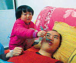 从那以后,宣萱就成了妈妈的小助手,每天帮爸爸擦身、洗头,给爸爸喂水果,如果爸爸挑食,宣萱还会边哄边喂,直到爸爸都吃完了她才放心。每天幼儿园放学回家,宣萱都会帮爸爸按摩,让爸爸进行各种恢复训练。