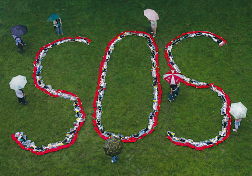 文胸组成“SOS”图案昨日,重庆教育学院美术系2007年年展冒雨开始,各个专业的学生纷纷拿出了自己的看家本领向大家展示着自己的作品。在学校图书馆正门前,一幅长12米、宽8米的巨型“SOS”图案引起了过往同学的注意。“我的天!怎么全部是女孩用的文胸哟!”一些女孩看清楚后红着脸不好意思地跑开了。