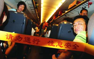 为防止发生意外,乘务员在每节车厢两头都绑上写有“请勿通行,注意安全”的隔离带。