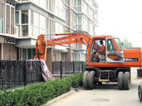 现场施工的一位负责人告诉记者,他们受雇于3号楼三单元一层的一位业主,主要进行地下室装修。挖掘机是业主以每天6000元的价格租来的,主要用来破碎地下室外面的露台。记者表示,从未见有个人家里装修请来挖掘机的,如此大的噪音已经让楼内的邻居有些无法忍受。该负责人也承认,动用这种大型机器装修确实扰民,但他表示,居民只需再坚持一天,挖掘机就会撤走。在记者与施工负责人的交谈过程中,由于噪音太大,必须贴在对方的耳朵上说话才能听清。