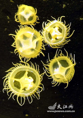 昨日,记者在江西南昌大学前湖校区内的双枫湖里拍到一群被誉为“水中大熊猫”的桃花水母群。专家称,桃花水母比恐龙还古老,可追溯到六亿五千万年前。它颜色各异,游姿美丽,仿佛水中的天使,堪称观赏水生物中的极品,具有极高的观赏价值。