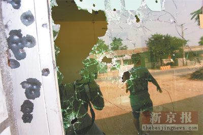 枪击案发生在九州村海强饭店附近。昨日中午,海强饭店门前的马路上,车轮过处,已经带出几十米的血痕。饭店门脸南侧的玻璃窗破碎,呈现出一近乎椭圆形的洞,洞周围的玻璃上有数个黄豆大小的圆孔。