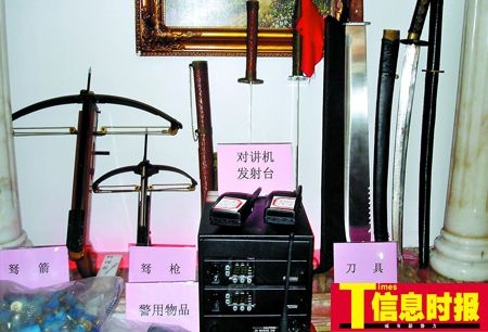现场还展示了开山刀。民警介绍说,这团伙成员非常迷信,用红绸布包着把柄,使用时还双手戴上白手套。缴获的犯罪工具中还有发射器,用来呼唤团伙成员的集合之用。