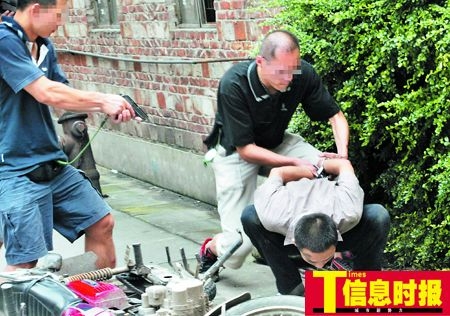 昨日早上6时15分许,便衣特警阿贵在路面巡逻时发现3名男子骑着一辆摩托车远远的吊在一名40多岁的妇女和一少女身后,行迹十分可疑,很有可能是刚刚报警中所说的那伙歹徒,于是阿贵立即对这伙人进行跟踪,并通知了附近的其他同伴。
