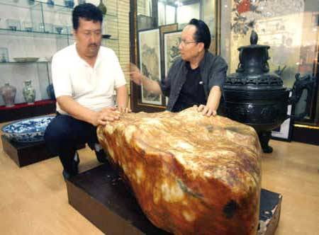 近日,一块全国罕见的稀世宝石——重达418公斤的和田籽玉现身东莞,这块玉将于6月30日在东莞定向拍卖,起拍价为1000万元,并还将在全香港征集命名和雕刻方案。掘宝人帕尔哈提、孙锐的共同心愿是:以此向香港回归十周年献礼。
