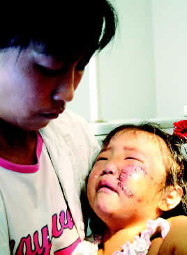 圆圆的脸蛋上,留着一排揪心的齿痕。这是一条刚刚下完崽的狼狗留下的,它毁了婷婷可爱的脸蛋,更在她的心中留下痛苦的印记。