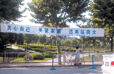 昨天傍晚6时,记者来到尧化门广场公园,发现广场十分安静,老头们在抖嗡;老太们在跳舞、练太极拳;小夫妻们牵着小孩儿在广场上玩耍;情侣们手挽着手在树林里谈恋爱。广场的入口前,一幅巨大的横幅“关心自己、关爱家庭,远离站街女”显得特别醒目,落款是尧化门街道综治办宣,没有一个人站在横幅附近。