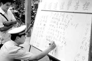 昨日上午,记者在花园路与纬五路交叉口处,看到一块小黑板上登记着几个人名,再看后面,才知道他们因交通违法而被民警曝光了,不少行人都在那里边看边议论。