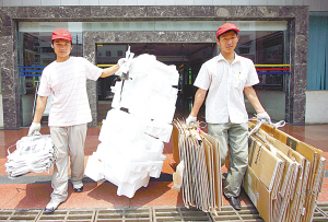 刚开始的那半个月,为了寻找废品来源,4人从早到晚东奔西走,到机关企事业单位和居民区联系客户,白天收购,晚上清理。有时没有运输工具,就手提肩扛;有时揽到一笔生意,无论楼层多高,他们都一捆一捆扛下楼……