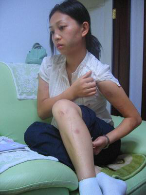 “当车开到宝塔附近时,李国的母亲拿出一块布,把我眼睛蒙上了,刘红在后面拽着我头发,两个老太太在我身上又掐又打。”王丽说,等她摘下布时,车已经开到城郊的树林中,两个老人和刘红把她拽下车,她们对她连踢带踹,随后她又被带上车。