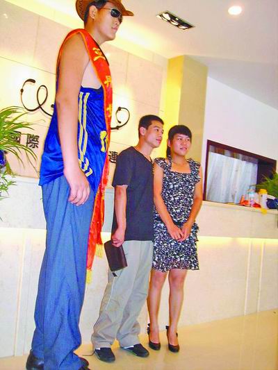 昨日上午,在平顶山市建设路上,一位“高人”引起了路人的注意。记者看到,他身披红绶带,在为一家婚纱摄影楼做宣传。他的身材非常高大,即使是1.8米的大汉,跟他站在一起都显得“渺小”。