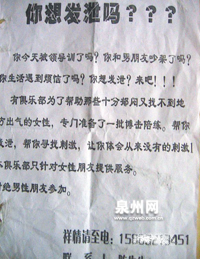 这几天来,厦门市街头出现了这样一份广告,该广告特别注明:只针对女性服务,谢绝男士参加。打人发泄2分钟收费50元