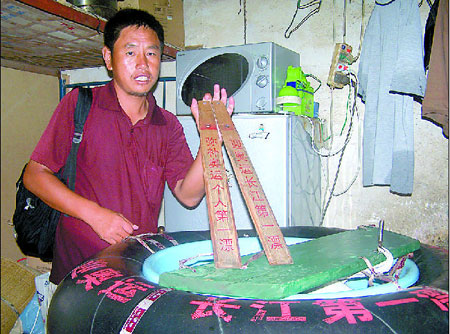 今年6月份,许多媒体报道了关于北京奥运火炬传递的新闻,程彦华遂做出决定:7月1日从重庆下水,沿长江漂流至上海。他告诉记者:“按每小时20公里的速度,我计划两个多月就能从重庆漂到上海。”