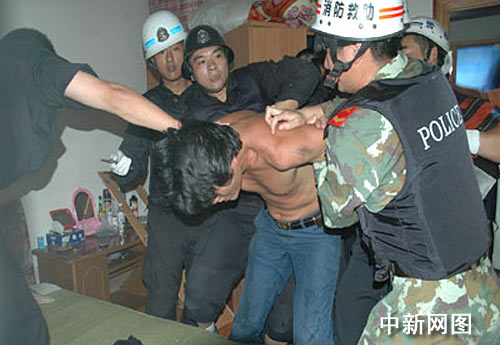 此时,该县医院救护车和医护人员也赶到现场。市民紧盯着四楼住户窗户,每个人的心都提到了嗓子眼。民警和消防官兵轮番向男子喊话,进行劝说,但任凭窗下的民警和消防人员怎样劝说都不开门,喊话持续了两个多小时,劫持人质者的情绪开始平静了一些,终于将劫持的孩子放了出来,可仍然不肯放掉另一名人质。消防人员和民警们继续与其谈判,并答应他提出的条件,可效果不佳,房内的人质生命仍然处在危险中。时间一分一秒过去了,救援人员见到男子情绪稍微稳定,消防官兵和公安干警继续喊话:语重心长地对他说:“你还年轻,人生的路很长,千万不可以因为一时的失足而造成终生悔恨,现在回头还来得及。”此时,男子提出要见这户人家的女主人,民警将该家女主人带到现场,让他们对话,吸引他的注意力,另一组身着防弹服消防人员和民警拿着房门钥匙候在门口,乘他们对话时注意力分散之即,消防队员夏建华飞快开门进入,与民警联手将其治服。