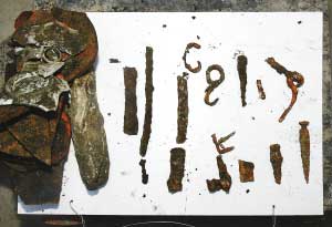 经过一个多小时的工作,在女二牢地下挖出了一个长一米、宽半米、深七十厘米的坑,里面共有16件铁器、一块条石出土。