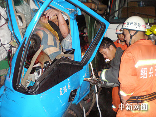 “杭金衢高速诸暨出口处附近发生两车追尾事故,后面货车里面有两人被困,另外又有三车和肇事车辆发生不同程度碰擦,情况比较危急,你们速去救人”,今日凌晨一点三十八分,浙江省诸暨市消防大队在接到该市公安局“110”指挥中心的指令后,当即出动车辆、人员火速赶赴现场营救。