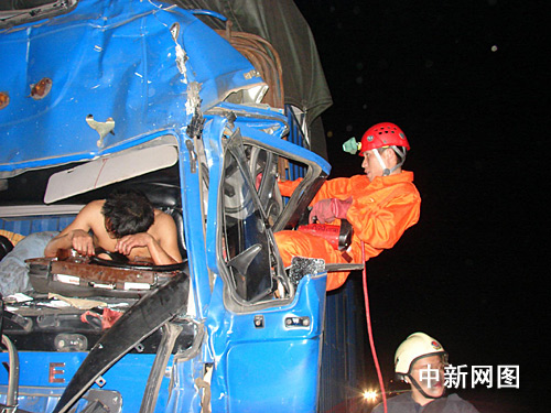 凌晨1时51分,南宁市应急联动指挥中心接到报警,南柳高速公路五合出口处10公里上发生货车追尾事故,造成2人被困。指挥中心迅速调集南宁消防特勤大队等赶赴救援。2点26分,经过40公里的长途奔袭,消防官兵到达事故现场。