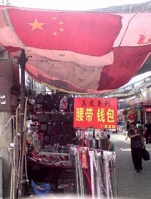 昨日下午,记者来到新华集贸市场采访。刚进市场,记者便看到一个用一面鲜红色的国旗和其他几块破布缝在一起做成的遮阳篷,虽然市场内的遮阳篷非常多,但是鲜红的遮阳篷在其中却分外显眼。
