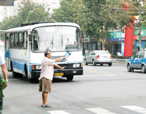 一名精神异常中年男子不定时地在台东三路和威海路交叉路口“指挥”交通,经常闹得交通大乱,车辆堵塞一条街。“劝不走,民警也管不了,真不知道该怎么办。”昨天,协警员叶师傅表示,这名男子精神异常,大伙很担心他在“指挥”交通时会发生危险。