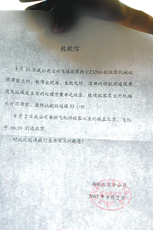 信上同时表示,昨日南航北京分公司安排飞机将旅客从兰州接到北京,对于此次延误“表示深深的歉意”。