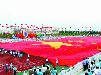 今年7月1日~2日,全国铁人三项锦标赛在睢县成功举办。其间,中央电视台《艺苑风景线》来睢县助阵演出。为烘托气氛,在演出《红旗飘飘》节目时,睢县人民政府与中央电视台联合创意,制作了一面面积为9600平方米的五星红旗,红旗上的大五角星直径是23米。这面五星红旗把全场2万多名观众全部覆盖,场面非常壮观。(记者 陈海峰 魏春辉)