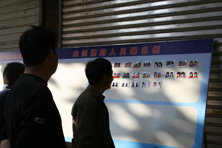 昨日18时许,记者看到,该派出所在南桥东巷一治安整顿办公室门前设置的宣传栏中,有一块“卖淫嫖娼人员曝光板”,上面张贴着卖淫女的正、侧两面像片。记者发现图片只在眼部进行了简单处理,其面目轮廓依然清晰,许多市民匆匆扫一眼便离去。