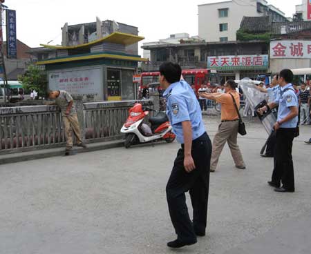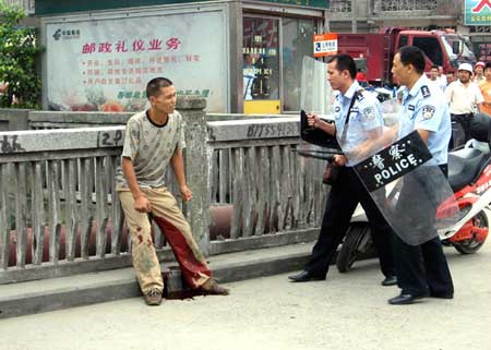 经过15分钟对峙后,张某依然拒绝缴械。一位民警持枪站在车门前与其对峙,旁边还有几位民警手持防暴盾牌将车门围住。由于这里地处中心城区,是主要的交通路口,现场很快聚集了上千围观群众。随着时间一分一秒地过去,张某的情绪愈发急躁。在民警第一次鸣枪示警后,他突然推开一扇车窗,从车上跳了出来。民警随即第二次鸣枪示警,令他就擒。然而,张某却挥舞着匕首和注射器试图往人群中冲,手持防暴盾牌的民警迅速将其逼到老东门大桥的桥栏上。