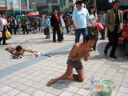 9月8日,两名残疾男子裸露着身体,在银川温州商城门前一趴一跪向行人乞讨,许多人见状纷纷解囊。