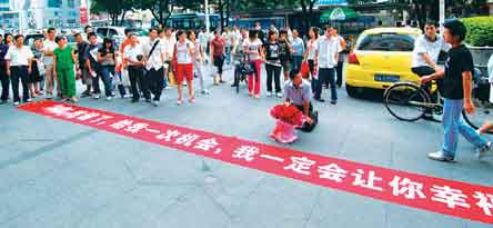 昨日下午3时许,在福州五四路新华都附近的通道上,一年轻男子手捧红玫瑰,低头跪在横幅中间,还不时地朝着楼上喊着女友的名字。
