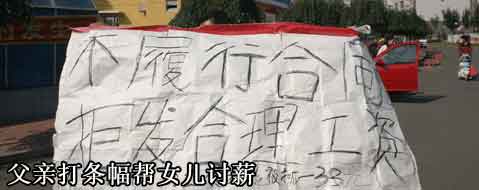 “不履行合同,拒发合理工资……”昨日8时,长春市南关区某小区一家幼儿园门前,一名幼儿园老师的父亲举着条幅,帮女儿讨薪。
