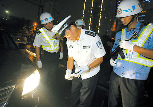 昨晚10点左右,当记者随同陈洪刚总队长行驶至五里店高架桥时,前面一辆白色奥迪轿车长时间在超车道上行驶。“这驾驶员有问题。”陈洪刚立刻指挥交警将该车拦截。