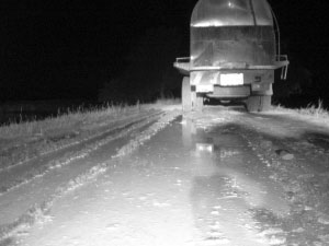 记者19时赶到位于肇东市宣化乡青肯河附近的放奶现场。刚一下车便闻到一股生牛奶的膻味。记者看到,两台罐车附近的地上到处是白花花的牛奶,绵延达二三十米,形成一条“牛奶河”。由于路面松软,被牛奶泡过的地方经车辆碾压形成车辙。在路边的下坡处,借着灯光还能看到残留着泛着白沫的牛奶。一台车牌号为黑M96570的罐车后部还稀稀沥沥地往下流着牛奶。其后停着一台车牌号为黑B65688的解放牌罐车,后面罐阀门也打开着。