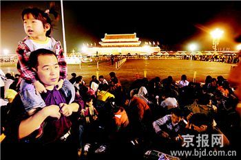 来自福建省泉州市62岁的林金青老人4点多就来到广场。“在奥运会和十七大召开之前到天安门广场看升旗,总算圆了我多年的心愿了。”老人兴奋地说,跟他从福建随团来北京的还有1080人,这几年党的政策好,家里有了点闲钱,大家都愿意出来走动走动,见识一下祖国的美好河山。来自浙江温岭农村的周宝山大爷带着全家特意来京看升旗,老人告诉记者,他还要带着孙子看看国家大剧院,要让他们亲眼看看全中国最现代最先进的剧场是什么样子。