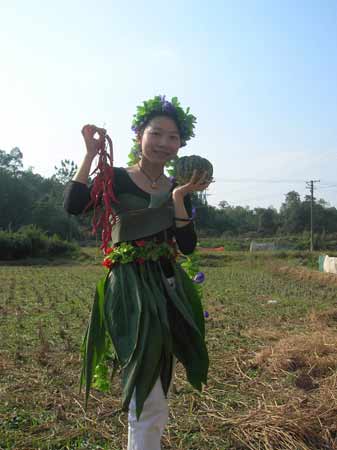 模特队里最别具匠心的还是队员们的演出服,红彤彤的辣椒、金灿灿的水稻、圆溜溜的南瓜,还有蔬菜、树枝,这些来自田野的植物全是她们的服装及道具素材。队员们告诉记者,农民模特队就要有自己的特色,农民主要跟绿色植物打交道,穿“绿色”服装最合适不过。