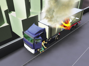 新闻提示:一辆混装化学品及棉纱等物品的加长大货车行至三元里收费站附近时,车厢突然发生爆炸,燃起了大火,而司机却浑然不知地开车继续前行。行驶百余米后,车厢再次发生爆炸,火势更加猛烈,幸好司机在第二次爆炸前已跳车逃生,腿部轻微受伤,并没有造成严重的人员伤亡。
