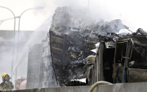 “一辆大货车顶着巨大的火焰,冒着黑烟,居然还在路上开!如同一个蒸汽机火车头。”王先生的家就在现场附近,早上8时15分左右他还躺在床上,从窗口瞥见了外面的事故。他开始以为自己在做梦。“不过很快车厢又‘嘭’地爆炸了一次,巨大的声音震得玻璃都直响。”等王先生回过神来,起床上了天台后,看到货车已陷入熊熊火海之中。“这车着火了,居然还开了百余米!”王先生说这辆货车至少烧了半个小时,消防车赶来时火烧得正旺。