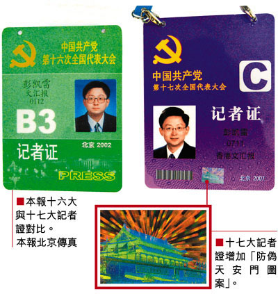 这次制证官方单位更为细致认真,香港《文汇报》记者证十六大时只标三个字“文汇报”,易与内地另一家文汇报混淆,这次,制证单位为该报所制的记者证均清楚标明“香港文汇报”。