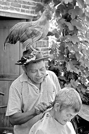 其中,他尤其“珍爱”各种美丽而骄傲的大公鸡。在挑着剃头担子进城下乡剃头时,他总是让心爱的大公鸡蹲在自己额头、肩上,无论是干活还是休息都是形影不离,成为始兴一绝。
