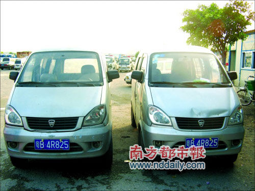 昨天下午4点钟,罗湖交警大队西岭下扣车场,丁先生的车和套牌车停在一角。“这简直就是孪生的嘛”,一位车场工作人员这样说,两辆车同为哈飞面包车,车型完全相同,颜色同为银灰色。