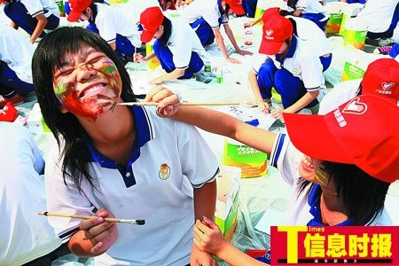 昨天,是广州市第十三届成人宣誓日,全市有15万名18岁青年参加了宣誓。在白云国际会议中心西广场的主会场,1800名18岁青年以涂鸦的形式来行“成年礼”,18岁的梦想和祝福五颜六色地铺满了整个广场,其中创作主题多以北京奥运和激扬青春为主。白云中学的岑翠齐和陈思敏还把涂鸦涂在了脸上,“从此天地由我们开创!”两位女同学充满憧憬。另外,广州话剧团还现场为同学们表演《18岁的青春》情景剧,送给所有18岁的青年。