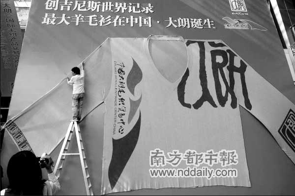 昨日在第六届中国大朗国际毛织产品交易会开幕式上,一件身长5米,胸围8.6米,袖长4.3米的大毛衫挂在交易会主会场入口处,经英国吉尼斯总部派出的验证官、省质量监督局毛织品检测站,以及常平公证处的工作人员现场认证,该毛衫目前为世界上最大的毛衫。目前大朗毛织贸易中心已经正式向世界吉尼斯总部提出“世界最大毛衫”的相关申请。